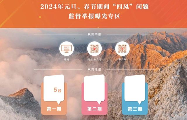 每一个节点都是对作风建设的一次考验。为持续强化正风肃纪,中央纪委国家监委网站推出“2024年元旦、春节期间‘四风’问题监督举报曝光专区”,加大典型案例通报曝光力度,坚决落实严的措施、释放严的信号。专区开设“我要举报”窗口,链接中央纪委国家监委统一举报平台,欢迎广大网友通过网站、手机客户端和微信公众号,对公款吃喝、在隐蔽场所违规接受宴请、违规收送礼品礼金、借操办婚丧喜庆之机敛财、公款旅游、公车私用等节日多发问题进行举报。专区从1月5日起,分3次集中对典型问题点名道姓通报曝光,强化警示震慑。