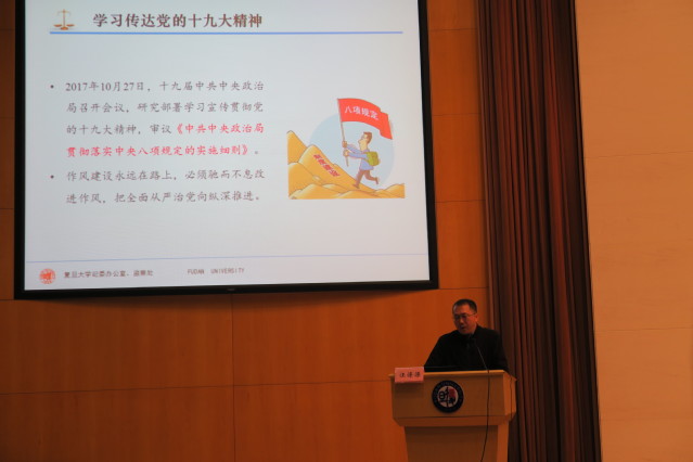 为深化落实党的十九大对推动全面从严治党向纵深发展作出的新部署,巩固和拓展落实中央八项规定精神成果,坚持不懈改作风转作风,使中央八项规定精神化作我校广大党员干部的自觉行动、行为习惯,学校纪委办公室近期正编印《深化落实中央八项规定精神教育警示手册》,同时组织开展“学习传达党的十九大精神、深化落实中央八项规定精神”专题培训,计划在邯郸、枫林、张江、江湾校区开展五场宣讲会,旨在通过操作性强、标准明确、案例生动、覆盖范围广的专题培训,增强广大领导干部、党员、教师的底线、红线意识和遵规守纪的思想自觉、行动自觉,持之以恒推动中央八项规定精神落地生根。